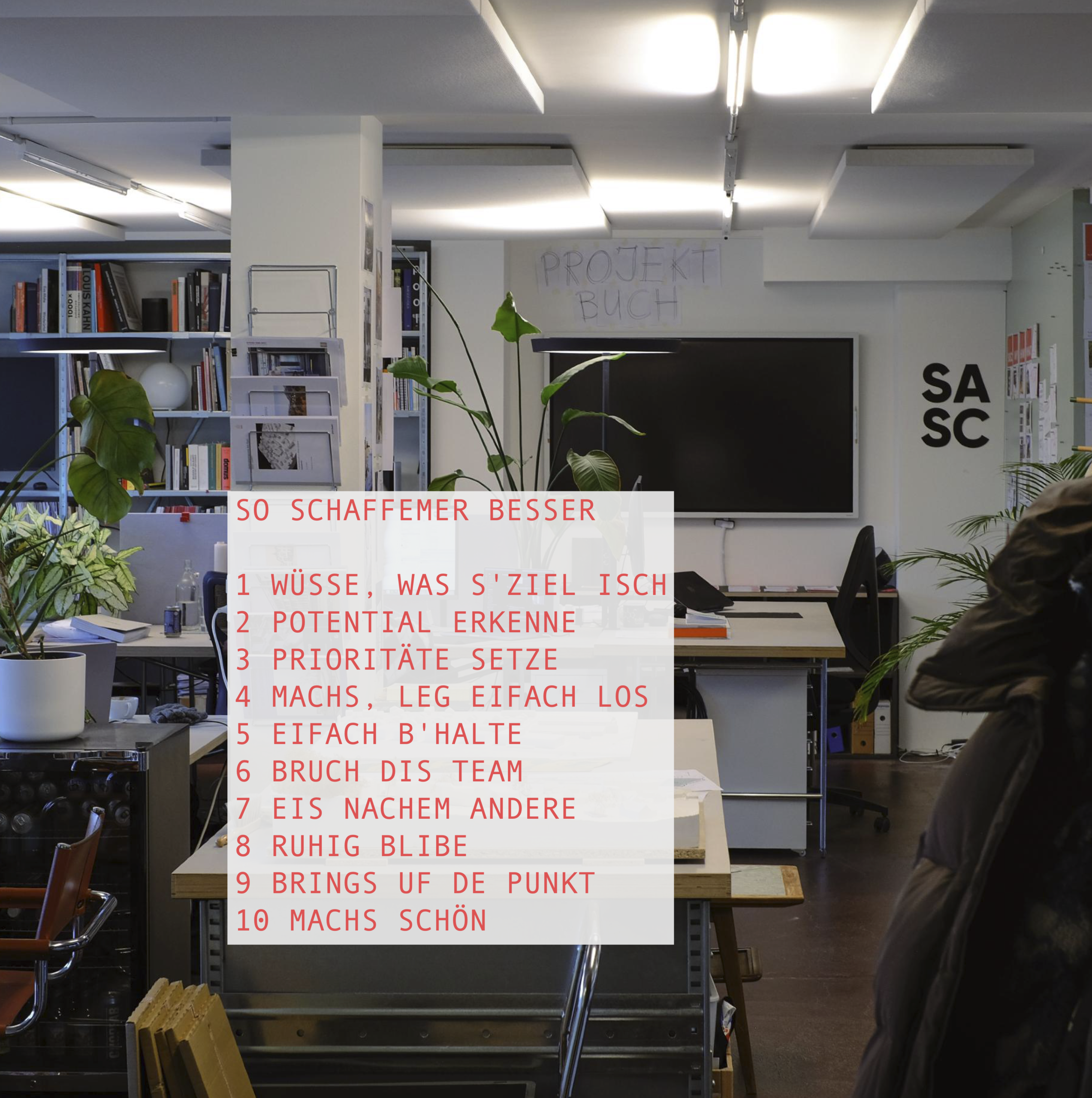 SASC wird von Oliver Sauter, Oliver Schmid, Silvia Schmid und Michael Zuber gemeinsam geleitet. Im Zusammenspiel mit dem gesamten Team entsteht ein Kosmos, der Ideen zusammenbringt und im täglichen Austausch kreative Projekte entwickelt. Ein breites Netzwerk von Partner*innen aus Entwicklung, Planung und Bau ergänzt unsere tägliche Arbeit und ermöglicht eine interdisziplinäre Zusammenarbeit.
