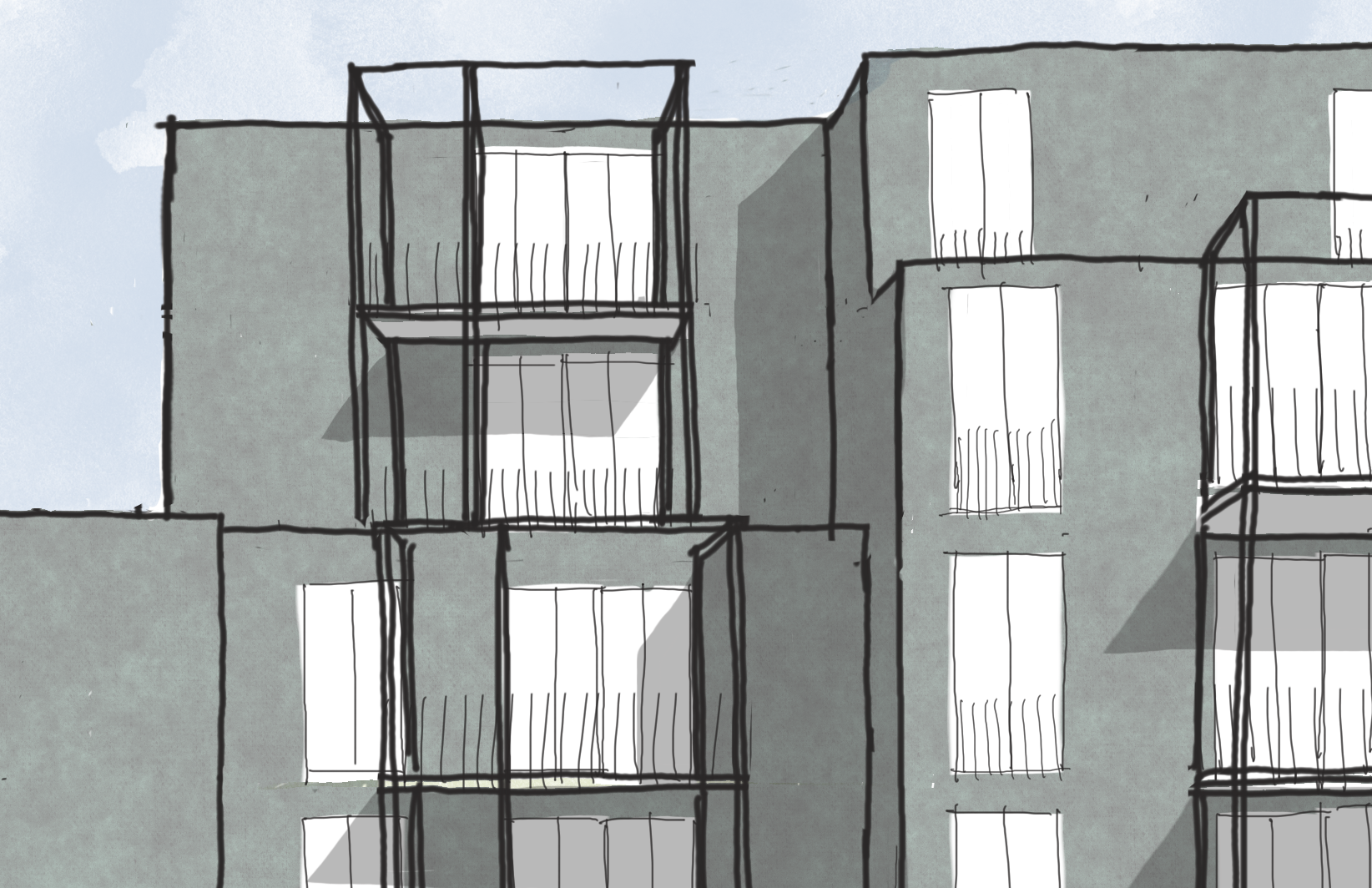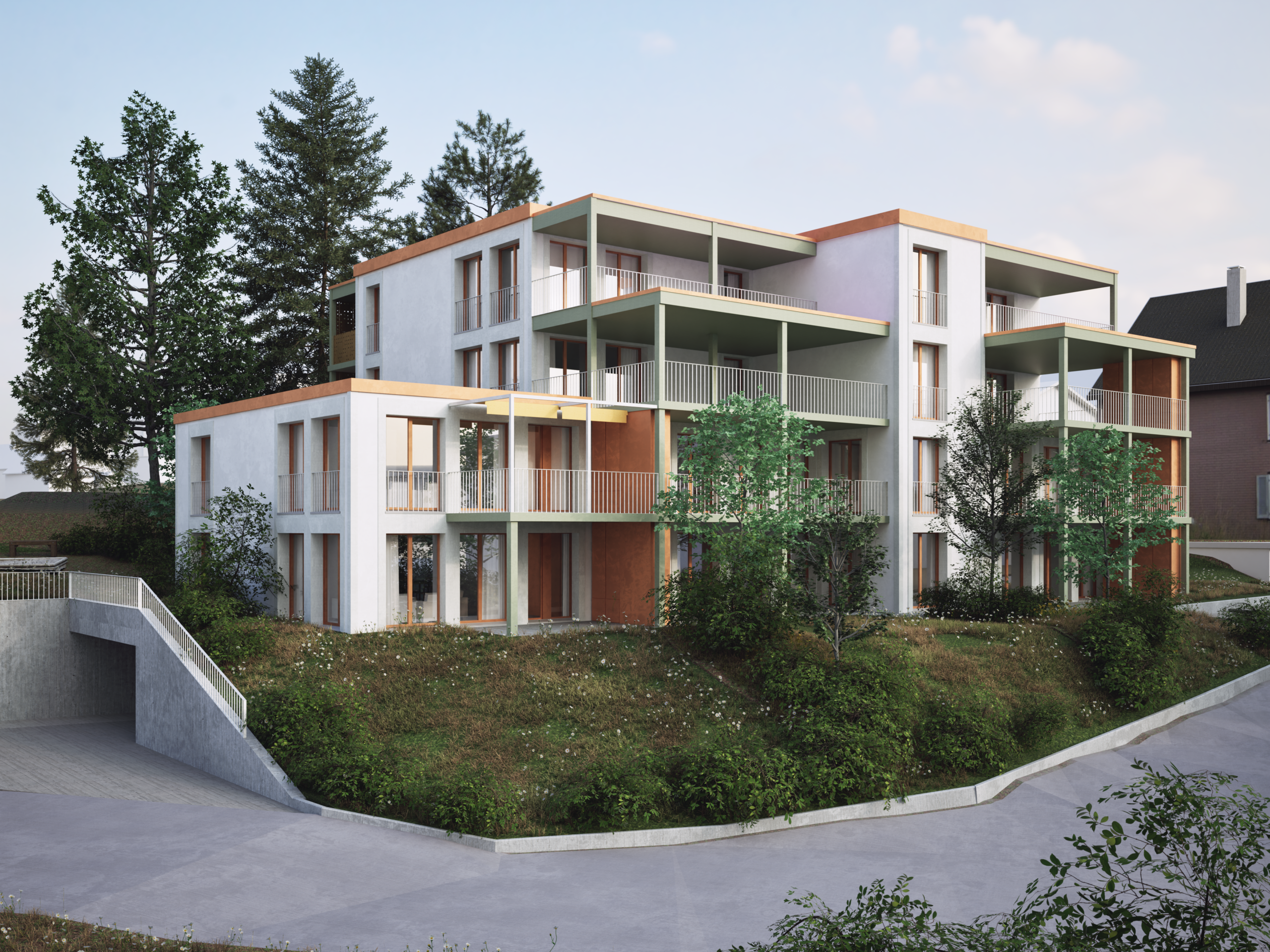 Lupus interpretiert die gewachsene Bebauung der Wolfkehle als präzise geformtes Mehrfamilienhaus mit vorgelagerten Aussenraumstrukturen neu. Die Leitidee betont die vertikale Gliederung und versteht die additiven Aussenräume zugleich als Erschliessung und Begegnungszone. So entsteht ein Wohnhaus, das private Rückzugsräume und informelle Nachbarschaft selbstverständlich miteinander verbindet.